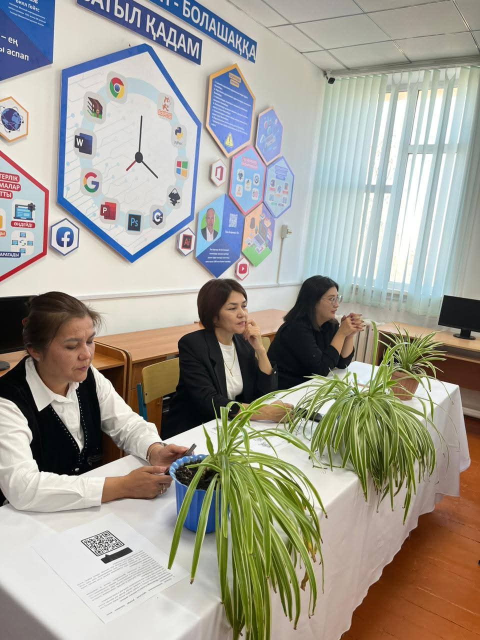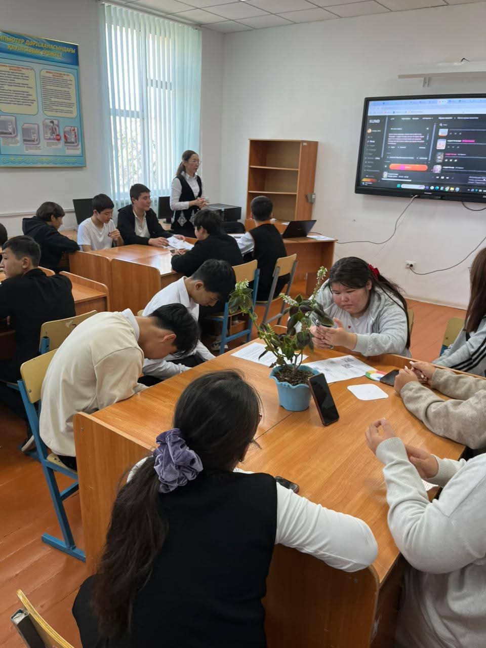 Тәжірибе сабаққа директордың оқу жұмысы жөніндегі орынбасары Г.Мирманова мен информатика пәні оқытушысы А.Боташова, физика пәні оқытушысы Г.Бердімұратовалар қатысып, білім алушылармен бірге ЖИ мүмкіндіктерімен танысты.