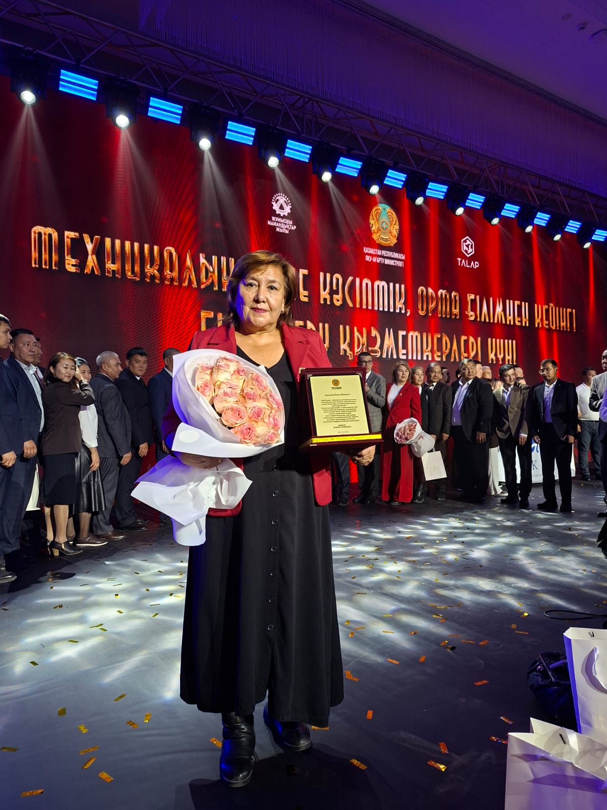 «Жұмысшы мамандықтар жылы» аясында, еңбек кәсібін танымал ету мақсатында «TurkicSkills—2025» халықаралық кәсіби шеберлік чемпионаты өтіп жатқаны мәлім. Осы жұмысшы мамандықтарының беделін арттыруға арналған шара барысында әріптесімізге оқу-ағарту министрінің марапаты табыс етілді.
